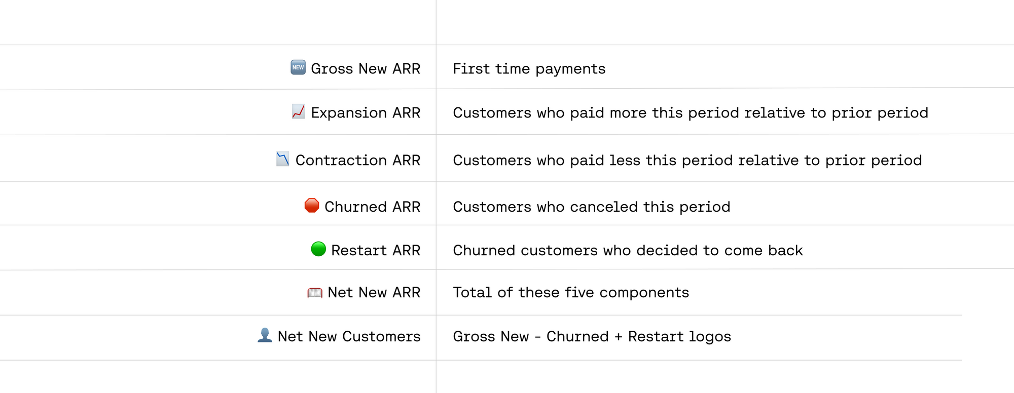This query is particularly useful because it makes the spreadsheeting very simple! Notice how each transaction is displayed as a line item in your workbook and breaks down revenue into five components: new, expansion, contraction, churn, and restart.