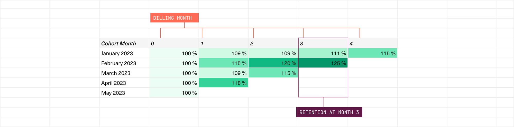 Cohort reports are usually set up so that the first column is by billing month. This will help you answer questions like: “what is your retention at month 3, month 6, month 12?” (every column will answer that question).