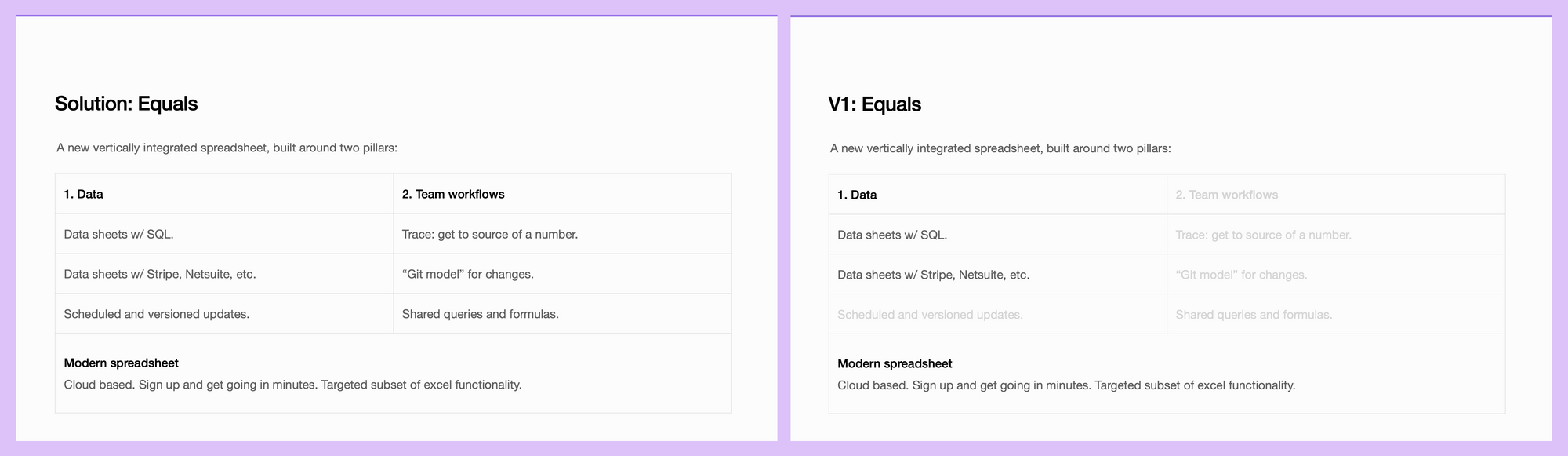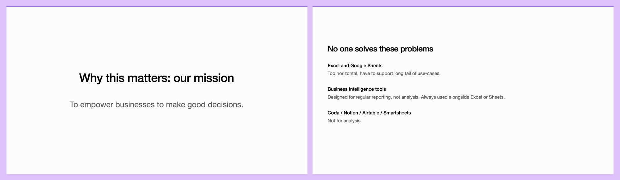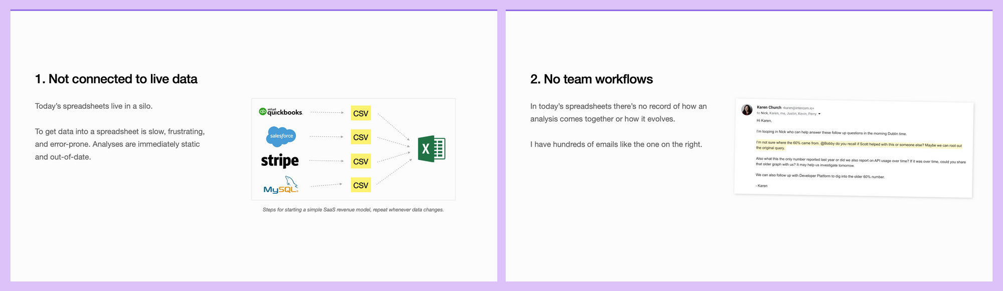 We took great care in articulating the problem we were addressing. Ben and I both experienced firsthand the problems with spreadsheets from our years working together at Intercom, but going through a laundry list of issues would just lose our audience. The problem is complex with many symptoms, but we distilled down to 2 root causes: spreadsheets aren’t connected to live data and don’t keep track of how analyses come together. Real life examples helped us underscore the pain of the problem and how widespread our market is, simply by how relatable the scenarios were.