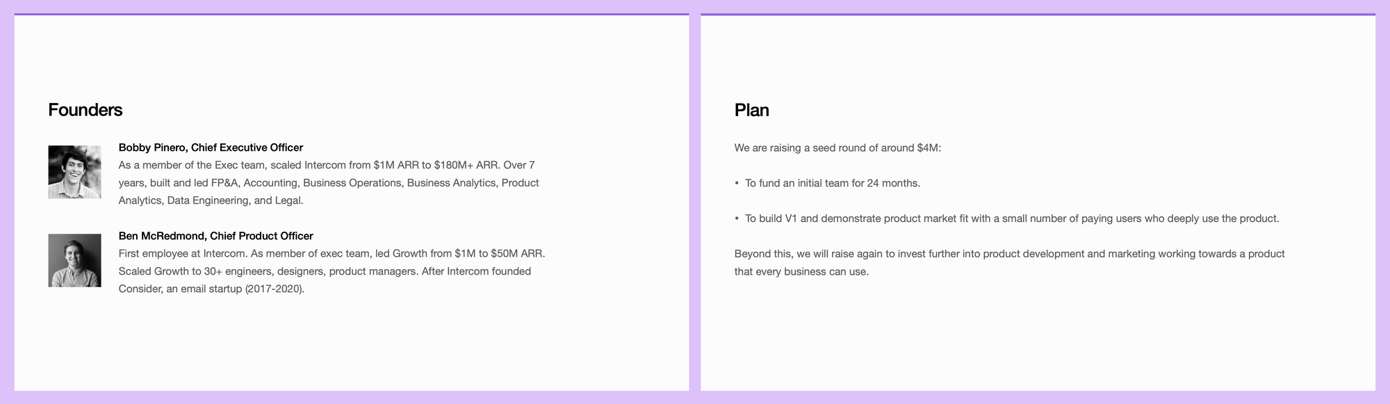 At the time, we were a team of two and we focused on differentiating ourselves from other teams that don't have an extensive track record of working together to build something great. We focused on our expertise leading teams and building a business, and allowed that to create credibility and trust with potential investors. We instilled confidence in our ability to execute the vision by wrapping it up with a concrete plan on how we were going to make something magical with the investment we sought. When pulling together the plan, we estimated the size of the team and the amount of time we'd need to build the first pass at the product, and added a bit of buffer time to gain adoption from users.